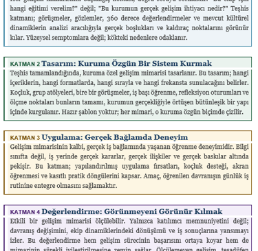 Gelişim mimarisi, bu soruların yanıtlarını bir bütün olarak tasarlar ve hayata geçirir. Sonuç, kurumun yaşadığı geçici bir deneyim değil; ekiplerin düşünme, karar alma ve birlikte çalışma biçimini kalıcı olarak dönüştüren bir yapıdır.