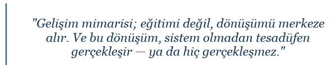 Gelişim mimarisi, bu sistemi tasarlamak demektir. Teşhisten tasarıma, uygulamadan değerlendirmeye uzanan; kuruma özgün, bütünleşik ve sürdürülebilir bir yapı.