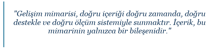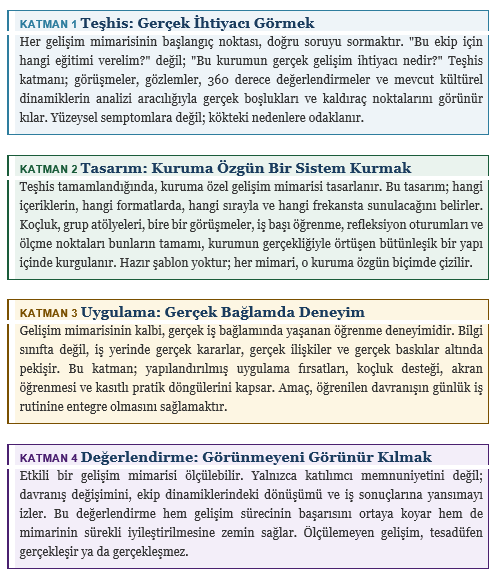 Bu üç soruyu bir arada tutmak hem derin bir uzmanlık hem de bütünsel bir bakış açısı gerektirir. Gelişim mimarı; kurumun stratejik önceliklerini, kültürel dinamiklerini, insan profilini ve öğrenme biliminin bulgularını aynı anda göz önünde bulundurarak tasarlar.
